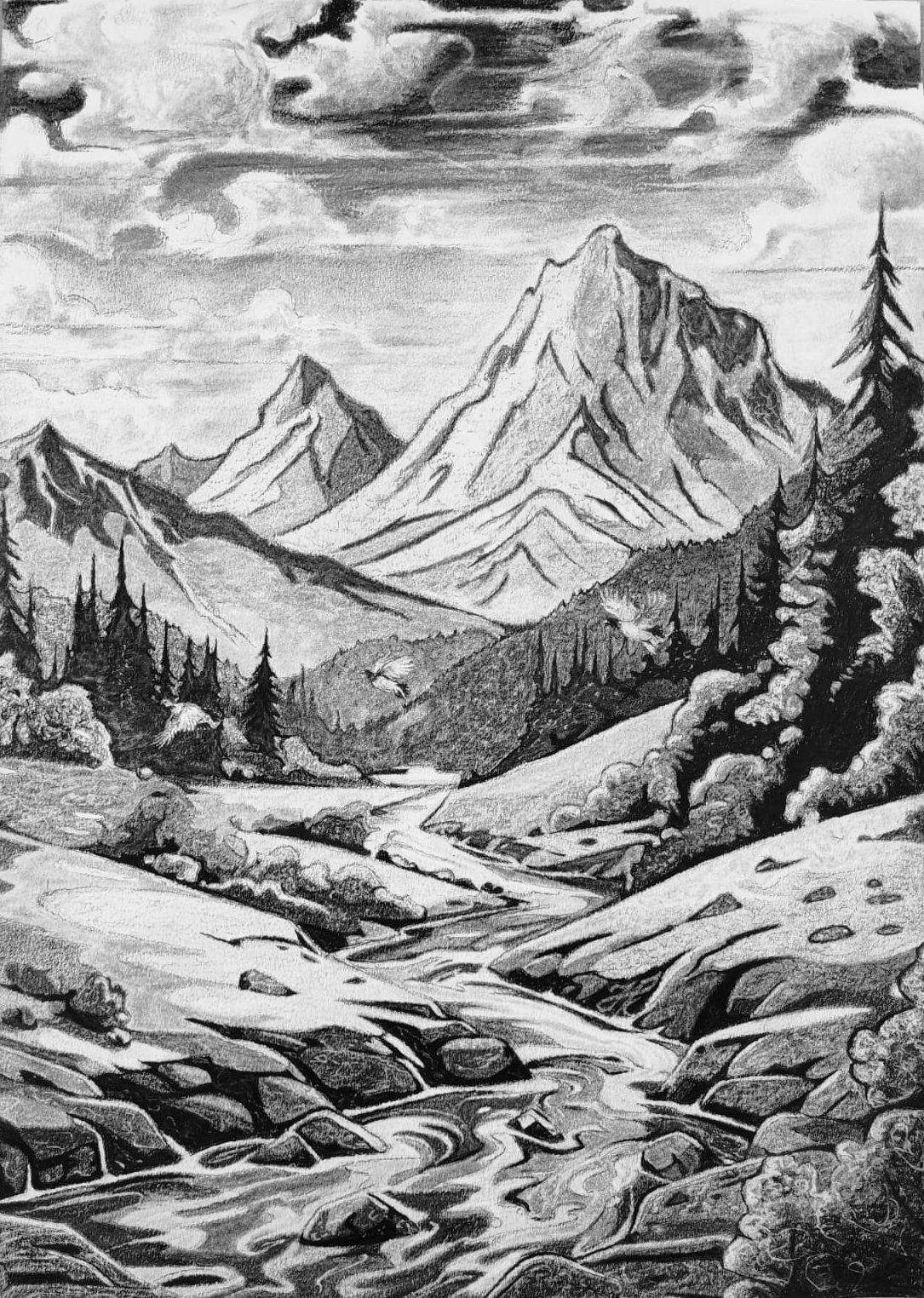 Taiteellinen näkemykseni Alaskan vuorimaisemasta jokiuomalla ja riekkotokalla! Taideteos on kooltaan 29,7 cm x 42,0 cm ja se on toteutettu hiilellä.